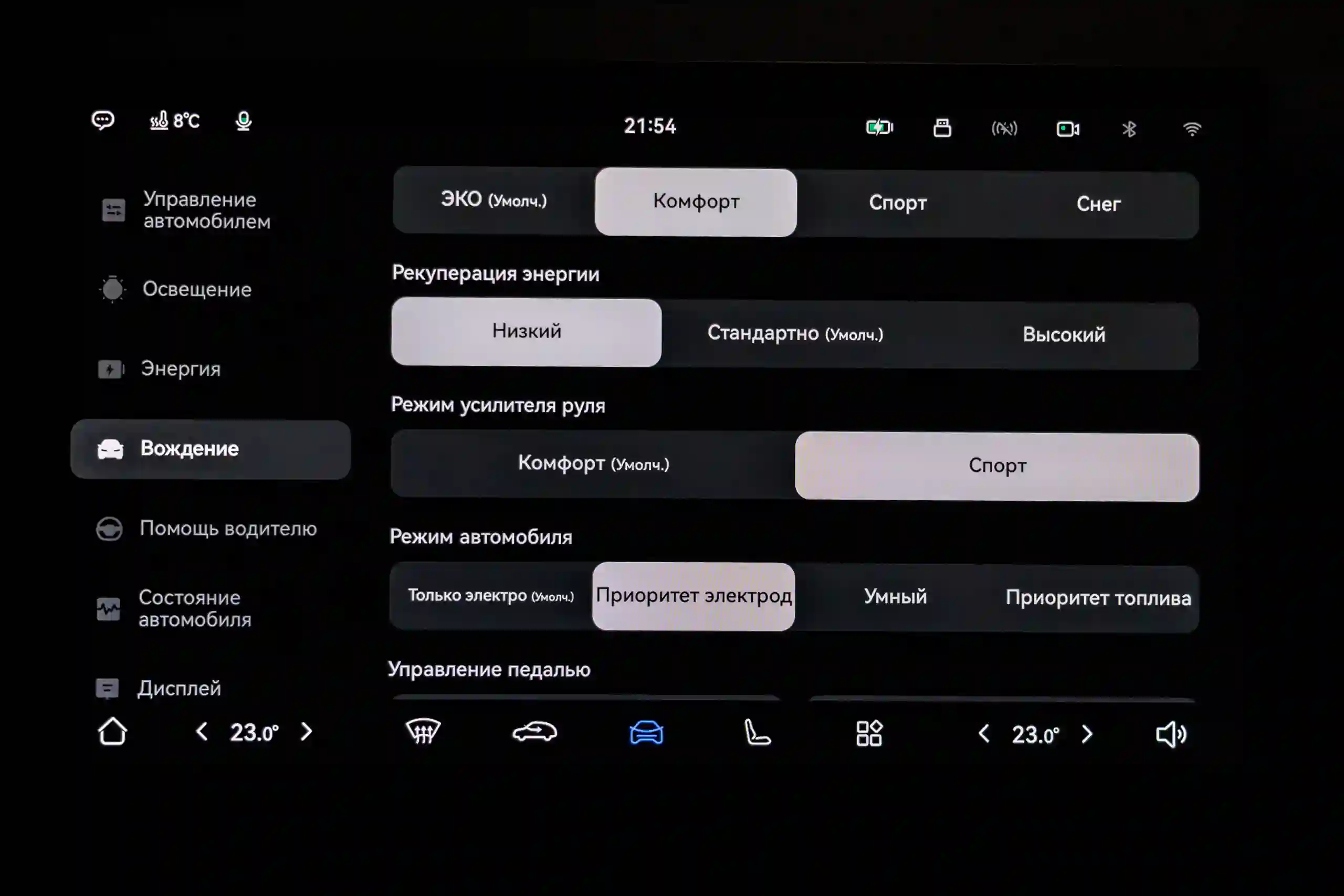 У новой модели в автоматическом режиме тише работает кондиционер и чуть мощнее замедление при стандартном среднем уровене рекуперации. Это может служить объяснением, почему она оказалась экономичнее дорестайлинговой в мерном параллельном заезде в режиме EV при одинаковых настройках. Первая «привезла» расход (по БК) 18,8 кВт·ч/100 км, а старая, обутая в точно такие же шины с тем же давлением — 21,2 кВт·ч/100 км.